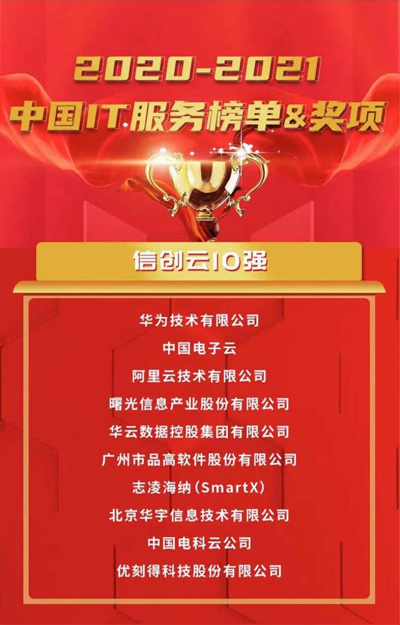 2021年2月25日,中国IT服务全媒体平台(ITSS媒体工作组)发布2020-2021中国信息技术服务奖项榜单,中国电子系统技术有限公司(简称“中国系统”)入围“中国智慧城市创新服务商10强”,中国电子云入围“信创云10强”,中国电子云飞瞰数据中台也获得“2020中国数据智能卓越奖”。